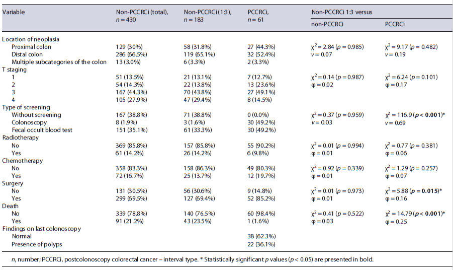 Surgery was performed on 85.2% of the patients of the PCCRCi group and 69.4% of the non-PCCRCi (χ2 = 5.88 [p = 0.015], φ = 0.16). More deaths occurred in the non-PCCRCi group with 23.5% events, compared to a single event in the PCCRCi group (χ2 = 14.79 [p < 0.001], φ = 0.25), with a mean follow-up period of 2 years.