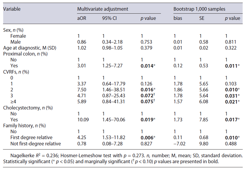 Univariate logistic regressions with crude OR showed an increased chance of PCCRCi for patients with CRC on the proximal colon (OR = 1.93, p = 0.039), two CVRFs (OR = 3.62, p = 0.032), and first degree of family history (OR = 3.22, p = 0.012). For the purpose of entering the multivariate logistic model, we considered marginally significant p values <0.10, thus interpreting as increased chance of PCCRCi for patients with cholecystectomy in the past (OR = 2.46, p = 0.088) as presented in Table 2.