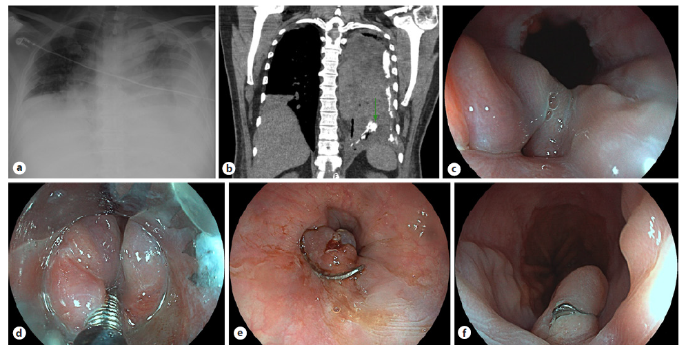 A 49-year-old man was transferred from a peripheral hospital following an episode of meat bone impaction during lunch which could not be removed by upper gastrointestinal endoscopy (UGE) on that Unit. The impaction was associated with spontaneous and self-induced retching. The patient was submitted to a rigid esophagoscopy under deep sedation with successful removal of the bone located immediately below the superior esophageal sphincter, with no evidence of severe wall damage. During the first day of recovery, the patient developed left and anterior severe thoracic pain associated with respiratory failure. Initial chest radiography revealed a left-sided pleural effusion and pneumothorax (Fig. 1a). Broad-spectrum antibiotics and oxygen therapy were immediately started. A thoracic catheter was inserted, allowing the drainage of a cloudy serous fluid with increased amylase, and positivity to methylene blue challenge, suggestive of a gastrointestinal tract perforation. Oral contrast cervicothoracic CT confirmed pneumomediastinum and left empyema with contrast leak at the lower esophagus level (Fig. 1b). After a multidisciplinary meeting, a UGE was performed on the 4th day, showing superficial laceration at the proximal esophagus related to the recent impaction and a 10-mm recent esophageal perforation in the distal esophagus (Fig. 1c). An 11-mm t-type OTSC (Ovesco, Tübingen, Germany) was selected. The perforation edges were grasped and captured into the cap using a harpoon device (OTSC anchor®) (Fig. 1d). The clip was then released and the perforation hole was successfully closed (Fig. 1e). On the fourth day after clipping, an esophagogram showed no leak, and oral intake was started. The patient was discharged on the 15th day postendoscopic closure, clinically well with resolution of empyema. Three months later, revision UGE revealed OTSC in situ (Fig. 1f) with effortless passage into the stomach. The patient remains clinically well on a complete diet.