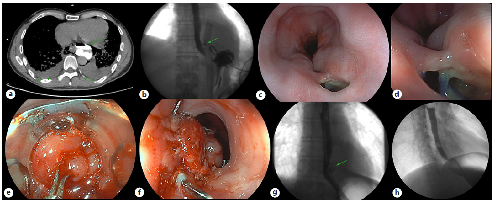 Fig. 2. a Cervicothoracic CT showing oral contrast extravasation from the esophagus into the mediastinum (arrow) and bilateral pleural effusion (arrowheads). b Esophagogram performed 12 days after surgery showing persistence of oral contrast extravasation (arrow) near the left distal esophagus wall. c, d Endoscopic view of two adjacent holes in the distal esophagus, being possible to look at some suture points. e Holes’ edges being pulled by OTSC anchor® into the cap, before clipping. f Esophagus after OTSC application, encompassing both holes. g Ten days postprocedure esophagogram showing OTSC in situ (arrow) with no contrast extravasation or signs of esophagus obstruction. h Nine months postprocedure esophagogram with no signs of OTSC, esophageal leakage, or esophageal stricture.