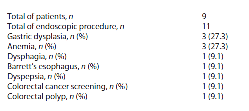 Nine patients (0.42%) with an initial negative RT-PCR screening test developed SARS-CoV-2 infection within 14 days after visiting our department. The median difference between the procedure and diagnosis of infection was 10 days (IQ 6.5-13). All these patients were confirmed to have a negative RT-PCR test before endoscopy. Their endoscopic procedures were performed in an outpatient setting: upper gastrointestinal endoscopy in 5 patients, colonoscopy in 2 patients, and upper gastrointestinal endoscopy plus colonoscopy in the remaining 2 patients. Table 2 summarizes clinical indication for endoscopies in these patients.