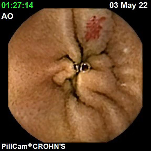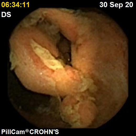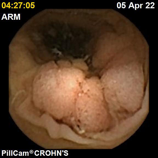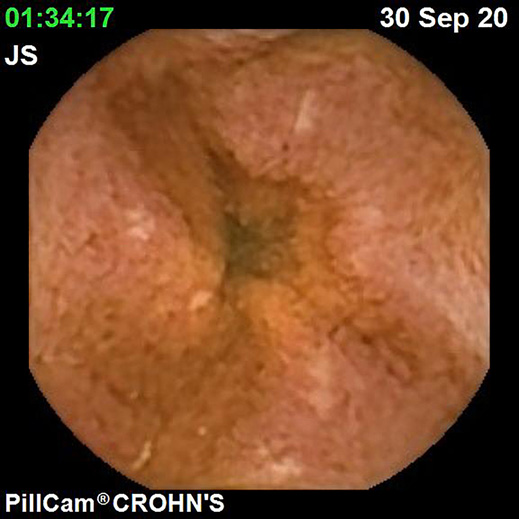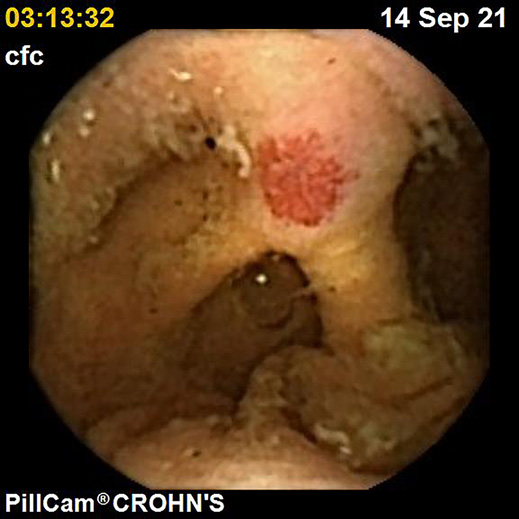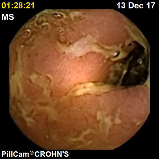 IBDs are a group of GI disorders characterized by chronic inflammation of the GI tract. The two main types of IBD are CD and UC. Colonoscopy and small bowel capsule endoscopy have a definite role in the management of patients with IBD [12]. The advent of PCE, allowing concomitant enteric and colonic evaluation, has created the expectation that this modality may allow a comfortable and accurate evaluation of the GI involvement in IBD in a single examination [3, 13]. Moreover, for IBD evaluation, patients are often submitted to separate colonic and small bowel evaluations, the latter frequently by radiologic exams. Hence, panenteric systems may also allow the avoidance of repeated exposure to radiation and overcome the limited sensitivity of radiology in recognizing inflammatory activity in proximal segments of the small bowel and colon segments [14]. Figures 1-3 document some examples of small bowel and/or colonic ulcerated lesions detected by PCE.