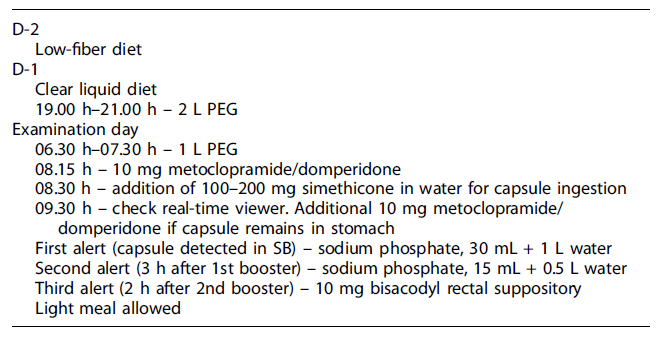 The PillCam® Crohn’s system is composed of four subsystems: the PillCam® Crohn’s capsule; the PillCam® recorder; the PillCam® software, and the Given® Workstation [10]. Bowel preparation includes a clear liquid diet on the day prior to capsule swallowing and administration of a polyethylene glycol electrolyte solution divided into two doses: in the evening before and in the morning of the examination day [11]. Following capsule ingestion and depending on its progression through the digestive tract, the recorder receives and interprets real-time input from the capsule and provides audiovisual guidance to patients throughout the procedure; an additional laxative boost, such as the sodium phosphate, is required in order to enhance capsule propulsion and maintain adequate cleansing of the colon [10, 11]. Table 2 summarizes the current standard bowel preparation protocol for PCE. The PillCam® data recorder emits sequential alerts along the examination, which trigger patient procedures and assist medical decisions: alert 0 informs the patient should take a prokinetic drug, such as metoclopramide 10 mg or domperidone 10 mg tablet by mouth; alert 1 suggests the intake of a laxative boost; alert 2 suggests the intake of a second laxative boost, after 3 h; alert 3 is given when there is a need to take a 10 mg bisacodyl suppository, after 2 h; alert 4 allows to eat a standard light meal, 2 h later; alert 5 marks the ending of the procedure and can occur any time after receiving alert 1.