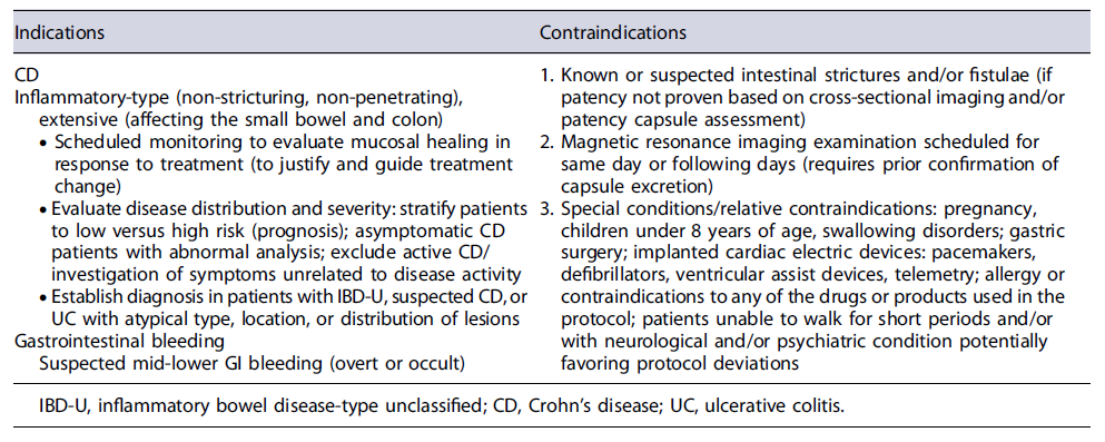 Regarding safety, a recent systematic review and meta-analysis reported a 2% rate of capsule retention for all indications, with a twofold increase in the setting of CD (relative risk = 4%) [28], while another meta-analysis described a retention rate of 4.63% (32 studies, 95% CI:[3.42; 6.25]) in patients with established CD versus 2.35%(16 studies, 95% CI: [1.31; 4.19]) in patients with suspected CD [29]. Although the risk of capsule retention is increased overall in patients with CD [29], it may be significantly decreased with the rationale use of dedicated small bowel imaging such as CT or MR enterography and/or patency capsule, particularly in the case of obstructive symptoms, known stricture or prior SB surgical anastomosis [30-32], where a patency capsule is still required even in cases of unremarkable cross-sectional imaging [31].
