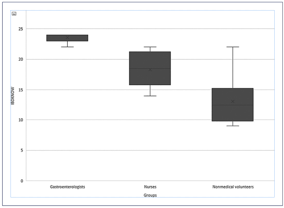 Therefore, the IBD-KNOW questionnaire was submitted to 3 groups of non-IBD volunteers with different levels of IBD knowledge (eleven gastroenterologists, ten nurses, and ten non-medical professional volunteers). For the second hypothesis, the IBD-KNOW score should positively correlate with disease duration. The score should also be higher in patients with higher education; however, it should not differ according to gender and disease type (CD or UC). Furthermore, we analysed convergent validity by assessing the correlation between the IBD-KNOW and the VAS for disease self-perceived knowledge.