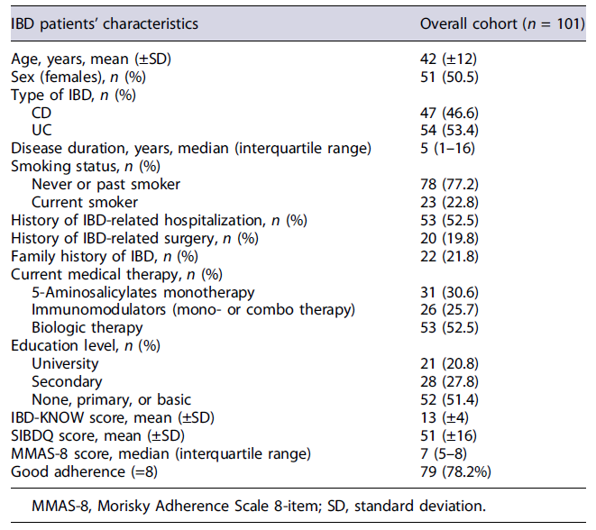 From July to November 2021, 108 patients with IBD completed the multimodal questionnaire; we excluded 7 patients from the final analysis due to less than 80%completion of the IBD-KNOW questionnaire. Thus, we included 101 patients (54 with UC and 47 with CD); the mean age was 42 (±12) years, with a similar number of female (n = 51) and male (n = 50) patients. The mean duration of IBD was 5 years, and most patients were treated with biologics (n = 53). Almost one-fifth of patients (19.8%) had undergone surgery at least once when they completed the questionnaire. Of the patients enrolled, 21 (20.8%) had a university degree. The socio-demographic and clinical characteristics of the participants at the time of completing the questionnaire are shown in Table 1.
