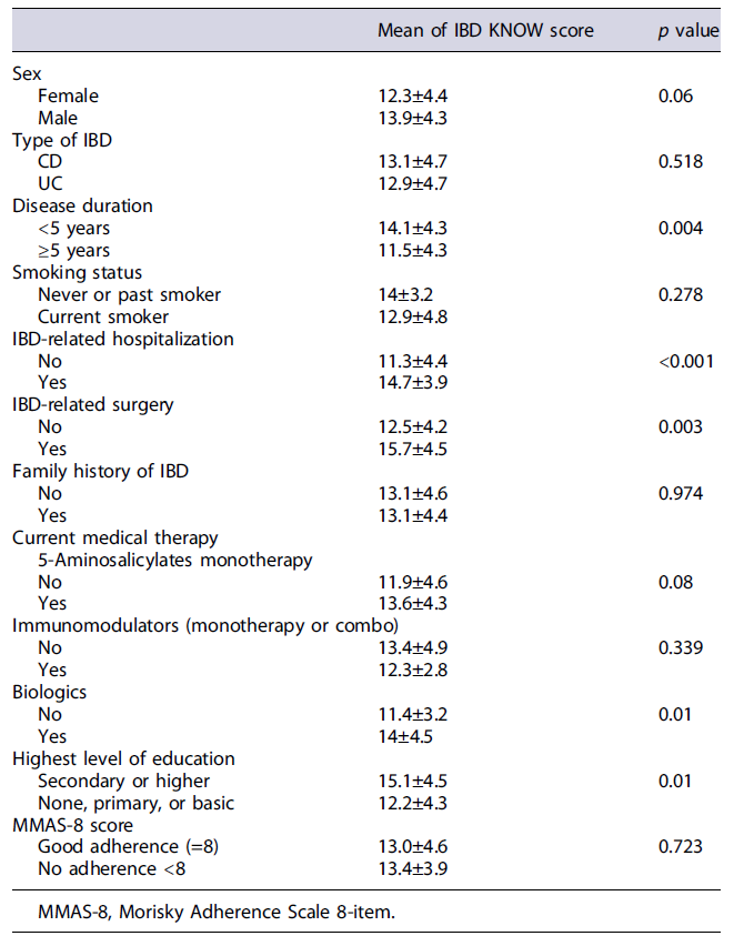 We found that disease duration (≥5 years), previous IBD-related hospitalization, and use of biologics are associated with higher score in multivariate analysis. These findings may be explained by direct exposure to IBD-related environments over an extended period, providing the patient with more opportunities to obtain disease-related information. Danion et al. [17] showed that an IBD diagnosis ≤3 years and the absence of anti-TNFα treatment for IBD are independent risk factors for low levels of knowledge. In addition, other studies corroborated that disease duration [8, 20], previous hospitalization for IBD [8], and use of biologics [20] affected IBD-KNOW scores. The need for step-up treatment strategy or the development of complicated disease (need for hospitalization or surgery) makes patients more concerned about their condition, which drives the search for information related to their illness. Contrary to the available literature [20], our study revealed no difference in IBD-KNOW score in patients with a family history of IBD, which may be due to the significant impact of direct exposure to IBD-related environments (e.g., hospitalization, surgery) among our patients compared to indirect exposure (e.g., family history).
