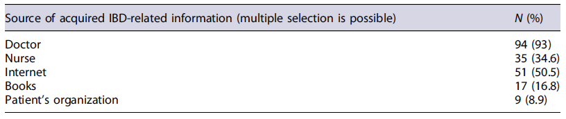 Patients acquired IBD-related knowledge mainly from doctors and the Internet. The sources of information related to IBD are summarized in Table 3.