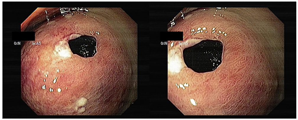 An abdominal and pelvic computerized tomography was performed, revealing an intramural collection containing hydroaeric levels in the right rectal wall, with a maximum diameter of 7 cm, compressing the rectal lumen (Fig. 2). The lower gastrointestinal bleeding and endoscopic findings were thus interpreted in the context of a rectal mural hematoma, communicating with the rectal lumen. The patient under-went conservative treatment, with complete reabsorption of the hematoma 2 months after surgery, which was confirmed by cross-sectional imaging and colonoscopy (Fig. 3).