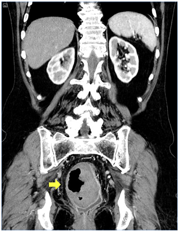 Fig. 2 Abdominal and pelvic computerized tomography revealing an intramural collection containing hydroaeric levels in the right rectal wall, with a maximum diameter of 7 cm, compressing the rectal lumen.