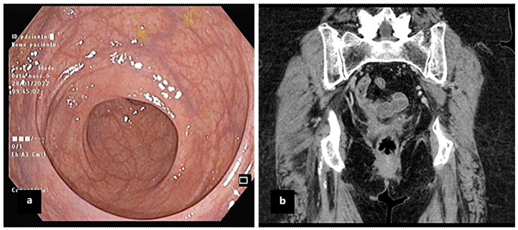 Fig. 3 Colonoscopy (a) and computed tomography (b) images confirming complete rectal hematoma resolution.