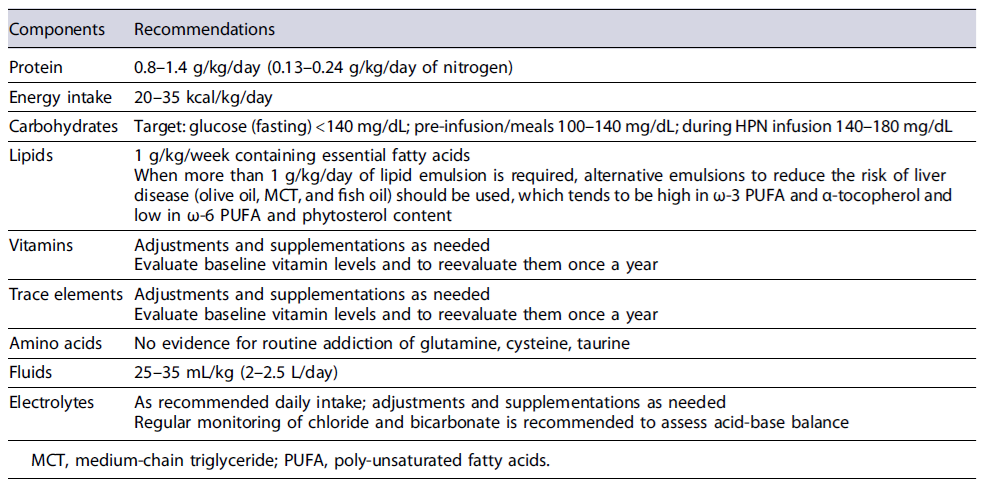 Table 3 summarizes the components of HPN [22-28]. The adequacy of HPN volume should be assessed by 24-h urine output and serial measurements of sodium, potassium, phosphate, magnesium, and calcium levels.