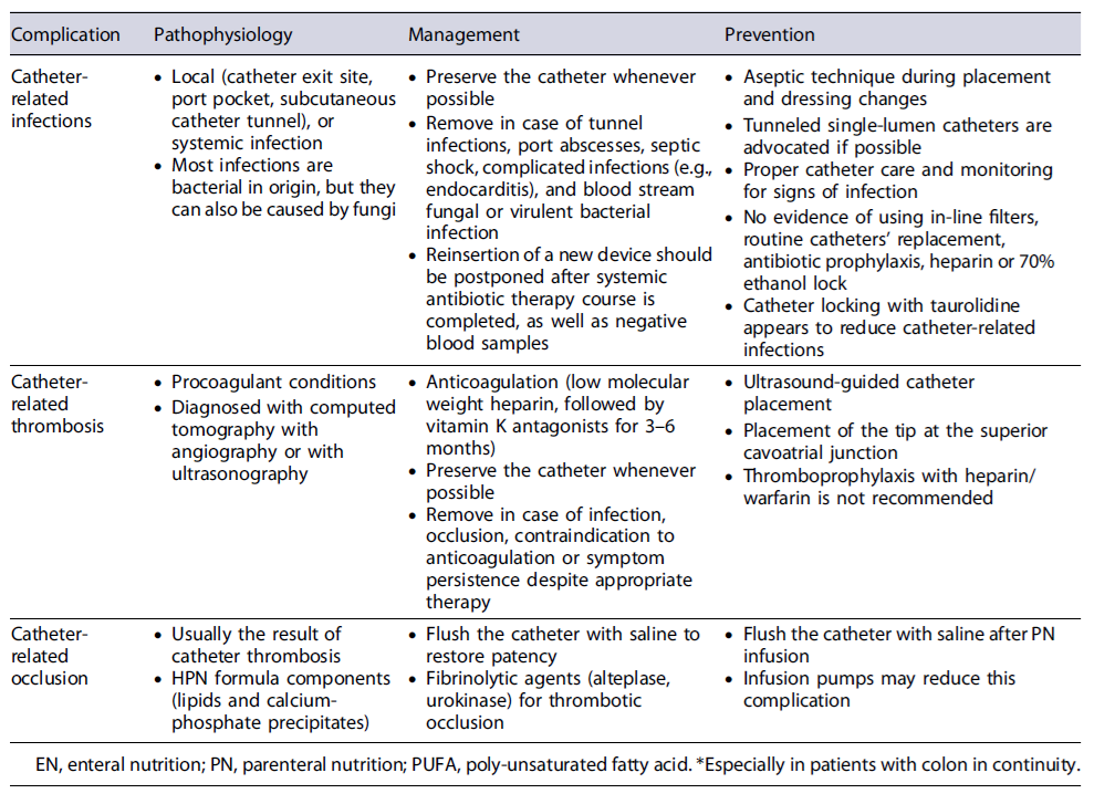 Patients with HPN require long-term central venous catheter (CVC). Current guidelines recommend ultrasound-guided catheter placement in a central vein (subclavian or jugular) by an experienced physician to reduce the number of immediate and late complications [7].