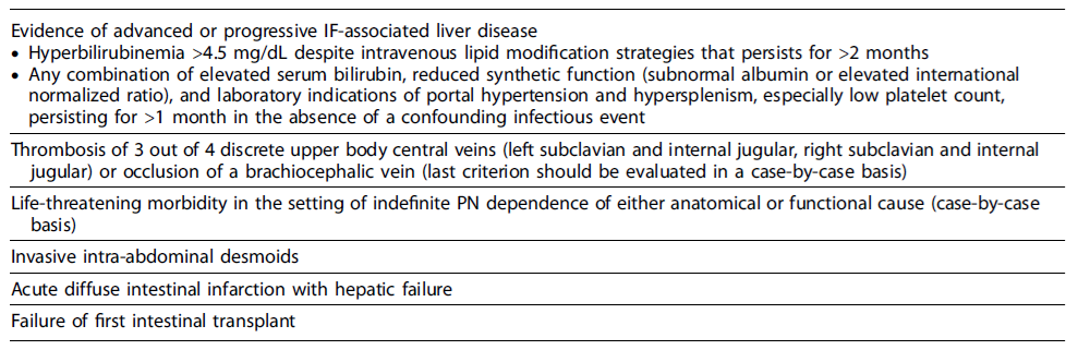 Indications for Intestinal Transplantation Treatment options for irreversible CIF include lifelong HPN or intestinal transplantation (ITx) [34]. Although HPN is considered the primary treatment for CIF, early referral to intestinal rehabilitation centers with medical and surgical expertise is advised.