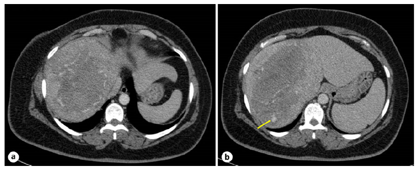 Fig. 1 Abdominal contrast-enhanced CT. a A 10 × 21 × 20 cm tumor of uncertain etiology in the right liver lobe with intratumoral spontaneously hyperdense foci suggestive of blood products. b Active bleeding (arrow) in the early arterial phase in segment VII.