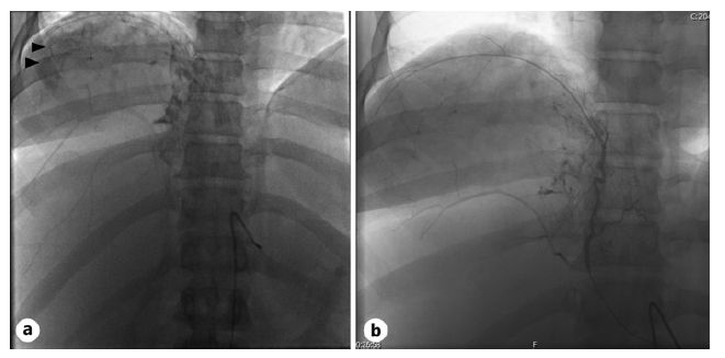 Fig. 2 Angiography images before (a) and after (b) embolization. Angiography was used to identify the vascular supply to the tumor, with the phrenic artery showing significant vascular supply (arrows). Supra-selective arterial embolization of the right and medium hepatic and phrenic arteries with polyvinyl alcohol embolic particles was performed, with cessation of bleeding.