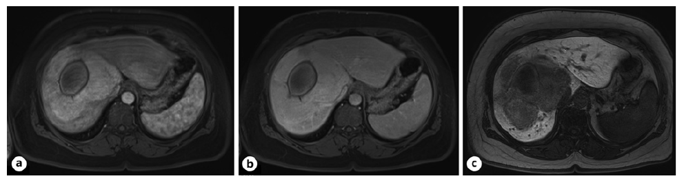 Fig. 3 Abdominal MRI with hepatobiliary-specific contrast. Peripheral solid component showing enhancement on arterial phase (a), isointense (no washout) on portal phase (b), and hypointense on hepatobiliary phase (c) mass with 7.2 × 6.1 × 4.6 cm in segments VII, VIII, and I with a central hematic area secondary to the previous bleeding, suggestive of an HCA, more likely inflammatory or hedgehog subtype.