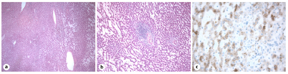 Fig. 4 Histologic examination. Low- (a) and high-power views (b) showing hepatocellular proliferation with trabecular growth pattern, sinusoidal dilatation, and inflammatory infiltrates. Immunohistochemistry staining of the tumor was liver fatty acid binding protein (LFABP) normal and heat shock protein 70 (HSP70) negative, excluding HCC. Furthermore, reticulin staining was intact, serum amyloid A (SAA) staining was positive (c), with normal nuclear β-catenin and glutamine synthetase staining, confirming the definite diagnosis of an HCA of inflammatory subtype.