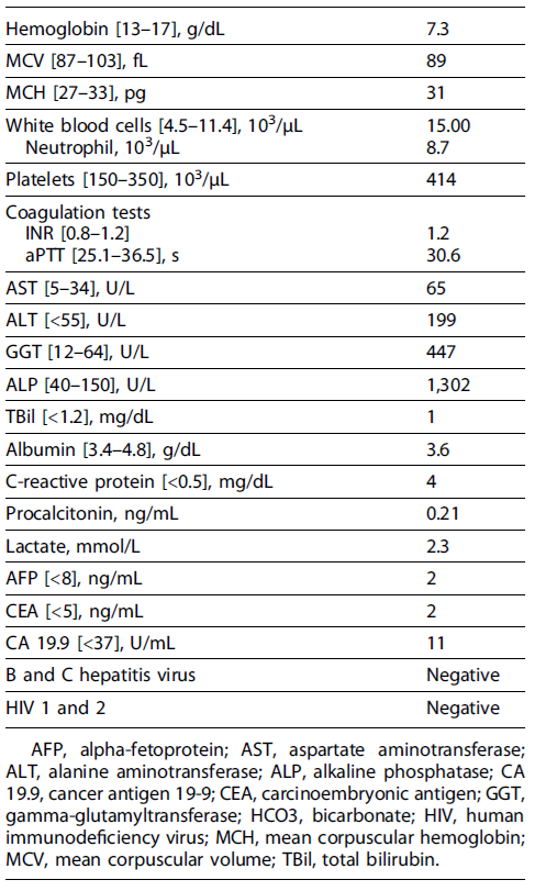 Prompt resuscitation with intravenous fluids and red blood cell units was initiated. Laboratory tests revealed a normocytic normochromic anemia with platelet count and coagulation profile within normal range and a cholestatic liver in jury (shown in Table1). Urgent abdominal CT angiography revealed 10 × 21 × 20 cm tumor of uncertain etiology in the right liver lobe with intratumoral active bleeding, with no signs of chronic liver disease (shown in Fig. 1).