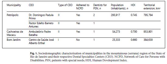 Among the municipalities belonging to this consortium, only Petrópolis, Bom Jardim, Cachoeiras de Macacu, and São José do Vale do Rio Preto have the installation of a secondary care service in their oral health care network, represented by the CEOs. However, in the period during which this study was conducted, the municipality of São José do Vale do Rio Preto did not offer the specialty of attendance to patients with special needs, and therefore, the authors opted not to include the CEO of this municipality in the study. The sociodemographic characteristics of the municipalities and their respective CEOs are shown in Figure 1 .
