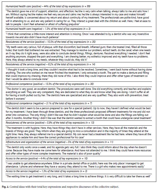 The content of the qualitative data was analyzed by means of the discourse of the collective subject 18 for interpreting the interviewees’ responses, performed by two trained researchers. The researchers read, transcribed, and identified the topics that arose in the data of each interview. The phrases, words, or expressions that referred to satisfaction or dissatisfaction with the services provided by the CEOs were underlined in the transcription. The level of agreement between the examiners during categorization was good (85.7%). This was calculated based on the selection of key expressions contained in the interviewees’ responses, and their respective classification according to the central ideas (Figure 2 ).