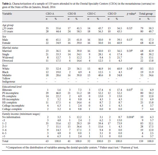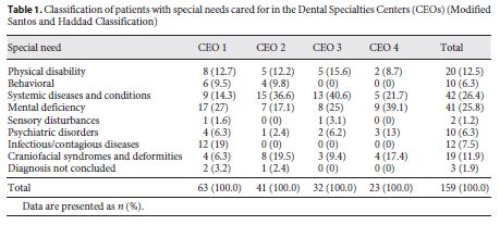 With the use of the modified Santos and Haddad classification 19, the results showed that the systemic conditions or diseases and metal deficiency were the most prevalent, with 26.4 and 25.8% of the total number of individuals interviewed at the CEOs, respectively (Table 1 ). Sociodemographic characterization of the sample is shown in Table 2 , in which significant differences were observed among the CEOs relative to educational level ( p = 0.03) and family income ( p = 0.004).