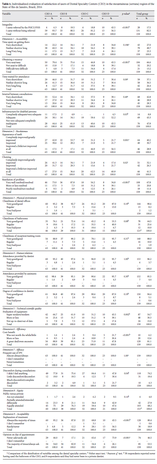 The comparative results among the CEOs showed that in general, significant differences were found among them with regard to the following dimensions/variables: accessibility/obtaining a vacancy ( p < 0.001), accessibility/infrastructure for disabled persons ( p = 0.03), resoluteness/appearance of the teeth ( p = 0.001), resoluteness/chewing ( p = 0.02), resoluteness/resolution of the problem ( p < 0.001), technical-scientific quality of the items of equipment/equipment ( p = 0.002), efficiency/cost-benefit ( p < 0.001), efficacy/discomfort during consultations ( p = 0.04), and acceptability/explanation of treatment and opinion about the day for making the appointment ( p < 0.001). In general, CEO B presented the worst evaluation in the variable infrastructure for disabled persons of the dimension accessibility. CEO C presented the worst results in the dimensions/variables: accessibility/obtaining a vacancy; resoluteness/appearance of the teeth and chewing; technical-scientific dimension/dental office equipment, and acceptability/opinion about making the appointment for consultation. In CEO D, the authors observed the worst performance of user satisfaction in the following dimensions/variable: resoluteness/appearance of the teeth and chewing; resoluteness/resolution of the problem; technical-scientific dimension/dental office equipment; efficiency/cost-benefit; efficacy/discomfort during consultations; acceptability/explanation of treatment and opinion about making the appointment for consultation.