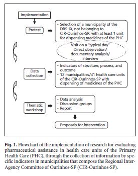 Health care evaluation, however, does not make sense if the outcomes are not discussed and analyzed, preferably by the actors involved in the evaluated service or activity. This participatory and shared mechanism is essential to achieve relevant outcomes to the studied reality [16 ,17 ]. Our study evaluated the pharmaceutical assistance of Primary Health Care in municipalities that compose the Regional Inter-Agency Committee on Health of Ourinhos-São Paulo (CIR-Ourinhos-SP), through structure, process, and outcome indicators, and proposed, in a participatory manner, interventions for providing the assistance together with local workers and managers, based on our findings.