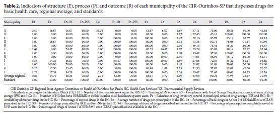 It is worth noting our limitation in collecting data of the R6, R7, and R8 outcome indicators, because of the absence of some sort of dispensing identification. For further discussion on access to drug in Primary Health Care, we included the R8 outcome indicator, which refers to the percentage of prescribed and available CBAF drugs, that is, the capacity of health care centers in providing essential drugs at this level of health care. The index obtained for drugs belonging to the CBAF of RENAME, prescribed and available in the health care centers of CIR-Ourinhos-SP, was below the established standard, which is 95% 34 , but higher than 74.94% when considering all prescribed drugs.