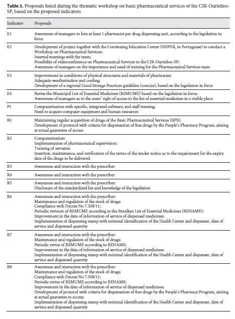 Our results are unprecedented within the field of regional pharmaceutical assistance, since all primary pharmaceutical assistance of municipalities that compose the CIR-Ourinhos-SP were assessed, through the collection of indicators established and recommended by the literature, and also by preparing, in a democratic and participative manner, an intervention proposal for the practice of the assistance. Thus, we could collect and discuss, in a participative way, indicators of an area of public health that grows and improves, but which still has problems related to structural and organizational aspects and professional training at the municipal level.