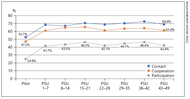 Fig.1. Contact, cooperation and participation rates throughout the data collection period. PSU, primary sampling unit.
