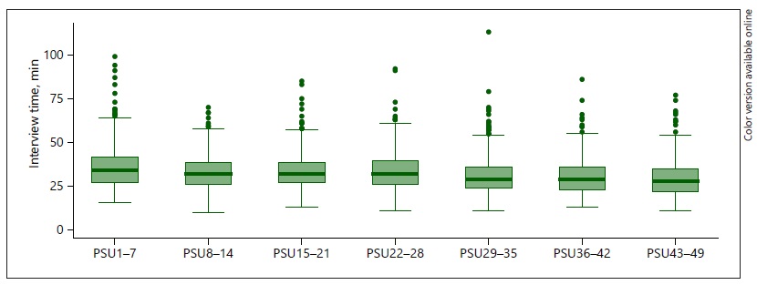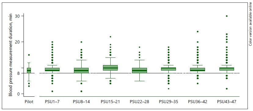 The distribution of time needed for three subsequent BP measurements is presented in Figure 2. The average time for BP measurement was 10 min. The proportion of measurements that lasted less than 8 min went down from 14.3% in the second PSU group to 3.3% in the seventh PSU group, indicating a 4.4-fold decrease in non-adherence to the standardized survey procedure.