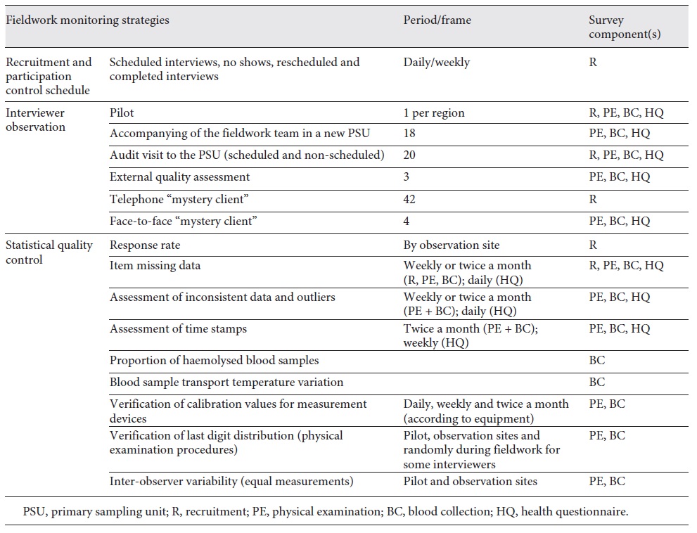 In the context of the health surveys, health examination surveys, where the information collected via a detailed questionnaire is complemented with objective information measured by physical examination and laboratory tests on biological samples, may provide more accurate and better-quality information [3]. However, the collection of objective information does not ensure data validity and reliability. The quality of a survey process, including its instruments and fieldwork adherence to study protocols, is crucial for accurate, reliable and valid results [4]. Considering that public health decisions are also based on health survey data, it is important to implement quality assurance procedures in order to prevent unacceptable practices and to minimize errors in data collection [4]. Survey errors can significantly influence estimates and invalidate study findings [5].