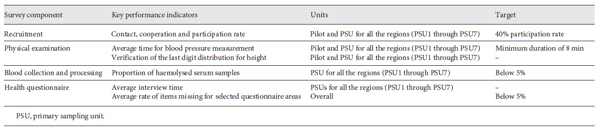 Close fieldwork monitoring and tracking of field progress can help identify key indicators of non-response and measurement error, which can be actively used to improve data collection and, consequently, data quality [10]. Standardization of survey procedures through the detailed fieldwork protocol, survey staff training and continuous monitoring of overall survey performance through tangible performance indicators (key performance indicators [KPI]), calculated from paradata collected during the implementation of the survey, constitute the main strategies for minimizing measurement errors in health surveys.
