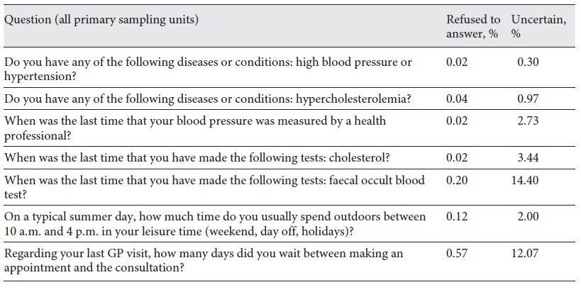 The HQ was administered by CAPI after PE and BC. The median interview time decreased over the fieldwork, from 34 to 28 min (Fig. 4). Considering as “missing” responses both “refused to answer” and “too uncertain to answer,” the missing values varied from 0% to 14.6% (Table 4). For the core survey questions, the proportion of missing values was below 5%. The questions regarding waiting time or duration presented higher proportions of missing values, up to 14.6%.