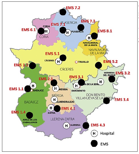 The Autonomous Community of Extremadura, located in the west-central part of the country close to the Portuguese border, is made up of the two largest provinces of Spain: Badajoz (21,766 km2) and Cáceres (19,868 km2). Its population is 1,092,997 inhabitants and its population density is low (26.5 inhabitants/km2) [9]. It is divided into 8 health areas, 4 in the northern province of Cáceres (Cáceres, Coria, Plasencia and Navalmoral de la Mata) and 4 in the province of Badajoz (Badajoz, Mérida, Don Benito-Villanueva and Llerena-Zafra). The health services mobilized to attend traffic accidents are coordinated by the ERCC-112, which, depending on proximity, availability, and initial assessment of the seriousness, will mobilize the appropriate resources from local clinics, health centers, or EMS to provide initial care for the victims. EMS are the health structures responsible for dealing with the demands considered emergency or urgent by the ERCC-112. Currently, Extremadura has 16 EMS units, distributed as shown in Figure 1. For the purpose of this study, they were divided into rural EMS, those located in a town or city where there is no hospital (8 out of the 16 units), and urban EMS, those located in towns or cities where there is a hospital (the remaining 8 units). General population data were from the Spanish National Statistics Institute.