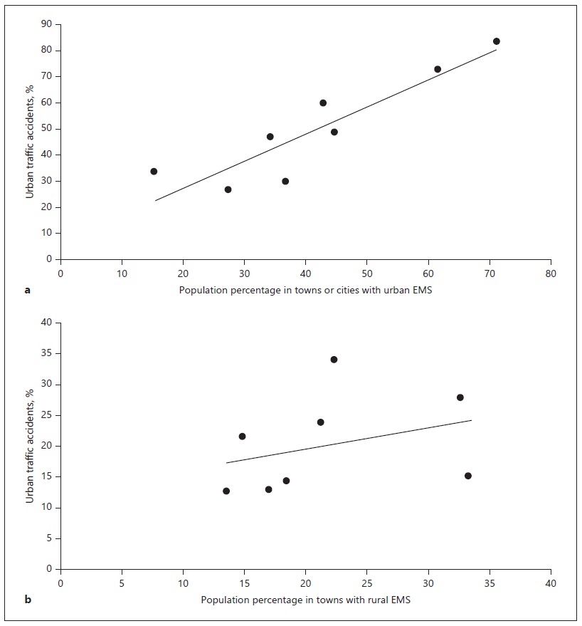 Fig. 2 Relationship between the percentage of urban traffic accidents and the percentage of population in towns or cities with urban emergency medical services (EMS) (a) or rural EMS (b) with respect to the total EMS-area population.