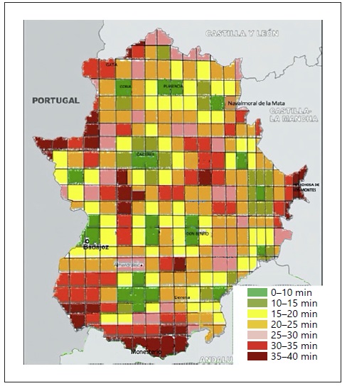 Figure 3 shows the map of Extremadura with the average response times by geographical areas where road accidents occurred in the 4 years of the study. The distribution of the range of colors clearly shows how the shortest response times (0-10 min) corresponded to the areas near towns or cities where EMS are located. On the other hand, the most peripheral areas of the region have the longest response times, i.e. more than 35 min.