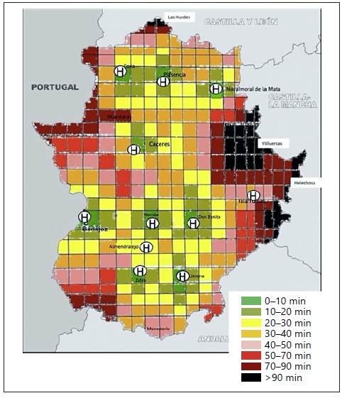 The average transport times of the EMS in Extremadura are also within the optimum range of less than 90 min [7, 11, 14], except in the north of the province of Cáceres (Las Hurdes region) and in most eastern (Villuercas) regions of the health area of Cáceres (Fig. 4). In those regions, transport times are longer than in other areas in the north of the province of Cáceres (e.g., Navalmoral de la Mata, Plasencia, and Coria), probably because their distances to the reference hospital are larger and they have no freeway.
