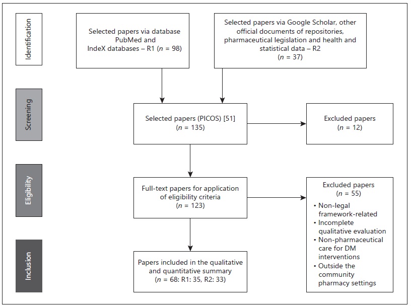 The literature review followed two research paths: path R1 - data collected from Google Scholar, PubMed, and IndeXed database; and path R2 - data collected from European and global health reports, among other health documents from international repositories (example, pharmaceutical legislation) and health statistics. R1 and R2 included the studies with the research question’s descriptors in all possible designations for the term “pharmaceutical care OR pharmacy services” (in English) and without a defined time interval. On the other hand, we used the time interval 2010 to 2020 for the descriptors listed in online supplementary Table S0 (see https://www.karger.com/doi/10.1159/000519498 for all online suppl. material). Afterwards, we selected only the descriptors related to Europe and each EU-UK country (EU and the UK). Before this evaluation, the studies had to fulfil inclusion criteria. The inclusion criteria for R1 and R2 consisted of empirical studies related to all health policies and guidelines/indications for pharmaceutical care provision in community pharmacies related to diabetes care. They focused on pharmacy services’ provision for patients with DM or T2DM with studies available and published in indexed scientific databases and full-text articles with a transparent and objective theme effectively related to the mentioned research question. The exclusion criteria included studies involving: (i) animals; (ii) people under 18; (iii) another type of diabetes (e.g., type 1 DM, gestational diabetes, diabetes insipidus); (iv) countries outside the EU-UK; (v) inconclusive studies; studies without access to the full text; and studies related to the article’s central theme with variations (for example, studies in a hospital OR hospital pharmacy environment, research in clinical trials, studies in health institutions other than community pharmacies). After this screening, we made the first selection and exclusion of studies. We validated the research question’s elaboration criteria: participants/countries, guidelines/protocols for providing community pharmacy services for T2DM (PS-T2DM), and health systems’ intervention in terms of compliance, accordingly; and then. We analyzed the full texts which were more relevant using the same criteria to determine their inclusion eligibility in the review. Next, we tracked the data collected following the abovementioned research routes, R1 and R2, and excluded repeated studies. The third part of the systematic review was the study quality evaluation. Next, we tracked the data collected following the abovementioned research routes, R1 and R2, and excluded repeated studies. Thus, the third part of the systematic review was the study quality evaluation. The next step was to do a checklist of criteria which included an intervention variable (exposure) related to the legal framework for pharmaceutical care services for T2DM (i.e., regulation, policies, and guidelines, indications, norms, protocols), available in all EU-UK countries, a control variable. The second evaluation followed another checklist based on PRISMA statement® methodology - Preferred Reporting Items for Systematic Reviews and Meta-Analyses [55], which contained the study eligibility criteria. This analysis ended with a third assessment of the study quality, but only of R1. It consisted of an evaluation of resources through a bias assessment tool called ROBINS-I [56]. The study analysis was predominantly interpretative and qualitative with a comparative approach between the eligible countries (EU-UK) and the two related pharmacy services, whose designation was based on PGEU terminology [8] - blood glucose measurement (PS-T2DM-BGM) and diabetes management (PS-T2DM-DM). Also, the final set of studies chosen described the pharmaceutical services applicable to T2DM and related to DM, varying from country to country and, therefore, differing in terms of sociodemographic context - a criterion not considered as a variable. The flowchart (shown in Fig. 1) illustrates the dynamics of identifying studies and selecting them for analysis, according to the PRISMA statement® methodology. Lastly, we systematized this information in tables and figures presented in the main text and supplementary material.