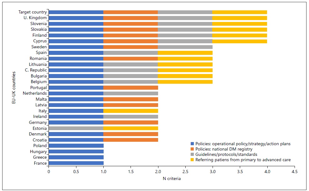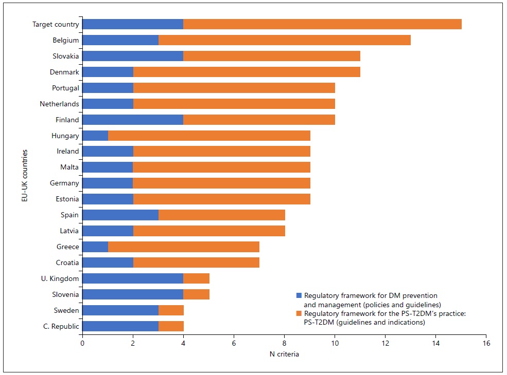 The first analysis was based on the perception of health policies for diabetes and their regulations (shown in Table 2, Fig. 2, and Table 3 of the supplementary material). As a result, we concluded that the UK, Slovenia, Slovakia, Finland, and Cyprus showed a regulatory framework for preventing and managing diabetes identical to the target country. In detail, we observed that: (i) 25 countries implemented action plans to minimize the burden of DM, and in 13 of them there was a national registry of DM cases; (ii) 20 countries had established guidelines, protocols, and standards for DM management, 14 of them implemented these rules thoroughly; and (iii) 19 countries followed guidelines and protocols for a medical referral from primary to a higher level of care, 13 of them implemented these rules entirely.