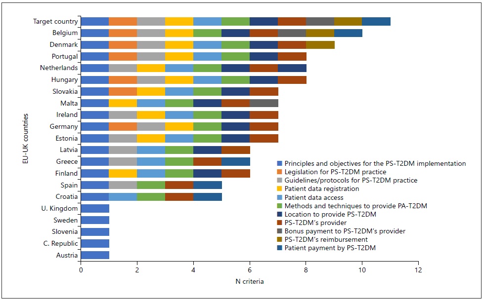 Fig. 3 International comparison: legal framework for PS-T2DM practice in European countries. The criteria were as follows: Policies corresponding to Question 1.1. of Table 3; Legislation corresponding to Question 1.2.; Guidelines corresponding to Question 2.1; Patient Data Registration corresponding to Question 3.1.; Patient Data Access corresponding to Question 3.2.; Methods corresponding to Question 4.1.; Local of the PS-T2DM’s Provision corresponding to Question 4.2.; PS-T2DM’s PROVIDER corresponding to Question 5.; Bonus corresponding to Question 6.1.; PS-T2DM’s Reimbursement corresponding to Question 6.2.; Patient corresponding to Question 6.3. Eight countries were excluded from this figure because they did not report or did not find valid information according to our criteria - Bulgaria, Cyprus, France, Italy, Lithuania, Luxembourg, Poland, and Romania.