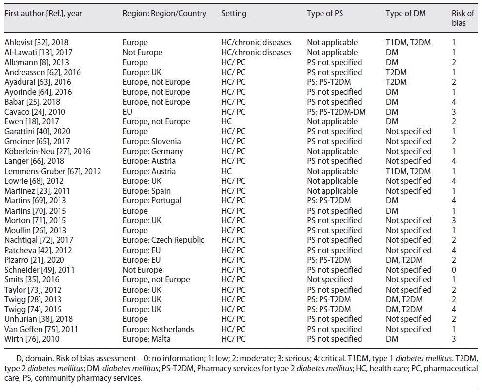 The literature review took the two paths of research, i.e., R1 and R2. First, we characterized the R1’s studies with the ROBINS-I tool [56] (shown in online suppl. Table S1 and online suppl. Fig. S1). Then, we explored 31 of these studies (shown in Table 1), according to the pre-established selection criteria (shown in Tables 2 and 3). Thus, we observed that 20 of these studies had relevant data to answer our research question; and the most mentioned theme in the studies was “pharmaceutical care” (17 studies).