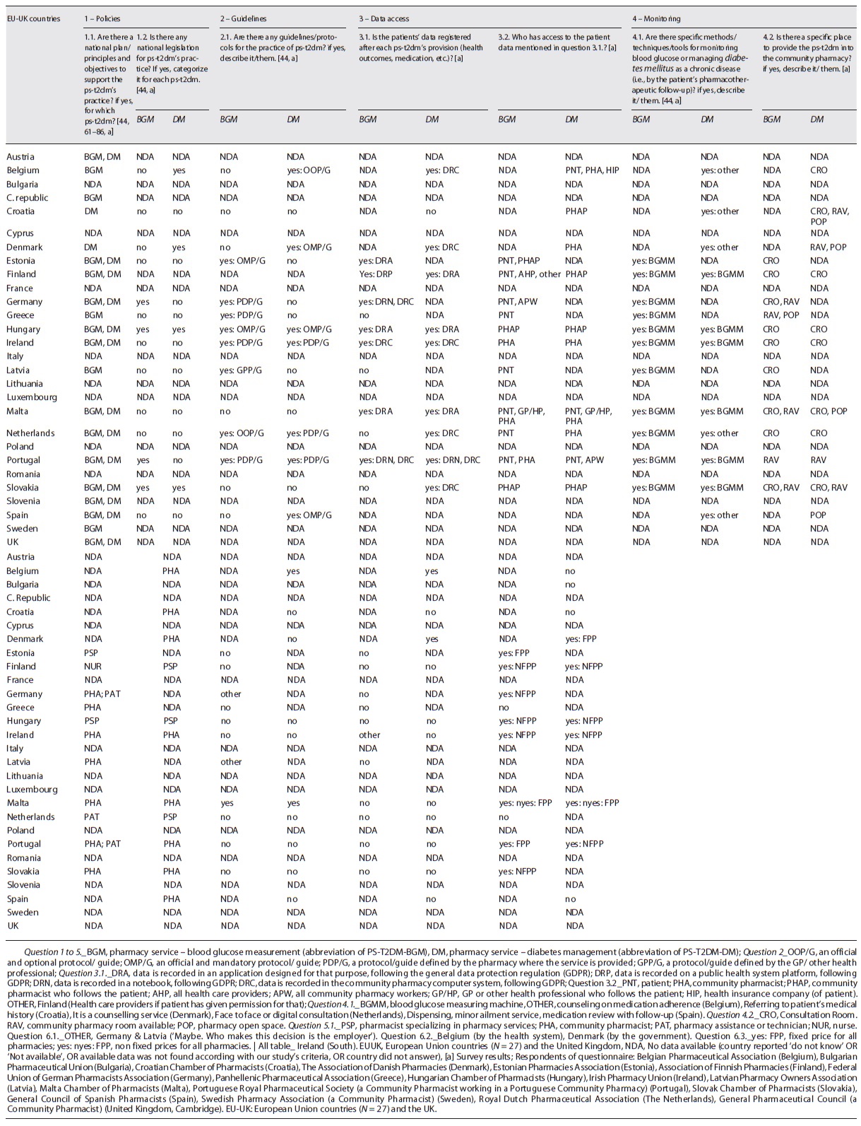 The World Health Organization (WHO) has appealed to international health systems to join multidisciplinary efforts to improve their annual strategic plans to fight diabetes. This call of action has mainly focused on hospitalization prevention, i.e., preventing diabetes-related complications (e.g., non-therapy adherence) and ensuring the follow-up of patients living in the community through proximity’s assistance provided by health professionals assistance, such as pharmacists in community pharmacies [7]. This role of pharmacists is based on providing health care that assesses the health status and the progression of the disease (i.e., clinical outcomes and medication history), ensuring the correct use of the medication and the maintenance of health results with a tendency towards normality (reference values, standard range, or reference range). Hence, it is called “Pharmaceutical Care” (PCNE, 2013) [8-10]. The provision of this care, in the context of T2DM, aims to identify the susceptible individuals (pre-diabetes, i.e., people with susceptibility to develop diabetes) or the patients (diabetes) through a blood glucose screening and the supervision of the medications’ administration according to medical indication (posology) [8]. In most European countries, this care is provided through services, or rather two services called “glucose measurement” (i.e., measuring fasting and occasionally postprandial plasma glucose levels) and “diabetes management” (i.e., pharmaceutical consultation for people with a previous diagnosis of T2DM) (PGEU, 2019) [9-26]. Therefore, in addition to the physician and pharmacist, other health professionals should also be part of the health care team that treats T2DM patients. For example, nurses, for their essential role in diagnosis and proximity to the patient; pharmacists specializing in clinical pharmacy or pharmacology, as specialists in pharmacological therapy; and also nutritionists, psychologists, physiotherapists, podiatrists, among others, for the indication of non-pharmacological therapies (e.g., modifiable lifestyle habits such as diet, mental health, physical exercise, diabetic foot, respectively, and other factors that promote quality of life of patients) [27-31]. However, there is a lack of evidence on regulations and legal bases to provide pharmacy services under the guidelines for Good Pharmacy Practice in the last decade in Europe. So, it is crucial to evaluate the legal framework for these community pharmacy services’ clinical and daily practice [33-51]. Therefore, our study sought to analyze whether, in European countries, there are guidelines/indications for community pharmacies to assist people with T2DM to assess whether it is necessary to improve policies or implement better practices. The study included 28 countries, the UK and all EU countries, and was based on a literature review and a questionnaire.