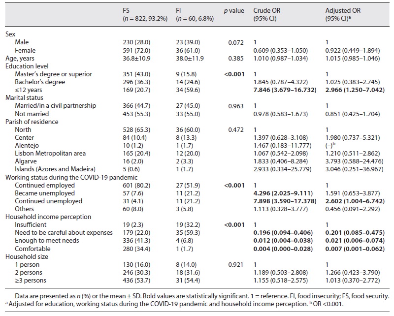 Logistic regression models were performed, and the odds ratio (OR) and the respective 95% confidence intervals (CI) were computed. For these analyses, food security status as food security and FI (including low and very low food security) was used. The final model was adjusted for education, working status during the COVID-19 pandemic, and household income perception.