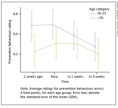 Adherence to the government-mandated preventive measures is shown to be critical to curb the spread of the infection, but there are individual differences in the extent people apply these preventive measures. For example, a survey by University College London including data from over 10 weeks showed that guideline adherence decreased substantially, from 70% at the start of the survey, to 50% at the end 26. However, this decline differed between age groups: while more than 60% of adults reported following the guidelines entirely, approximately only 40% of younger adults reported doing the same. Other studies during prior epidemics have shown similar results; during the SARS epidemic in Canada in 2003, younger adults reported following the guidelines less, and also perceived the situation to be less risky, compared with older adults 27. Prior research also shows that older adults perceive higher risk and behave more cautiously than younger adults concerning health-related activities 28 and that self-reported risk perception in social, financial and recreational domains increases with age 29. Furthermore, older adults report perceiving more risk of mortality if infected with COVID-19 5. Together, these findings indicate a clear trend for lower risk perception in younger adults, relative to older adults.