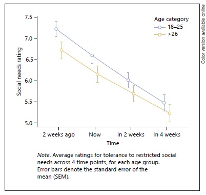 The measurement of social needs (i.e., tolerance to restricted social contact) was assessed with 6 items where 1 was “low tolerance” and 10 was “high tolerance”. Again, ratings were obtained for all 4 time points. See online supplementary Table 3 for most and least highly rated items for all time points.