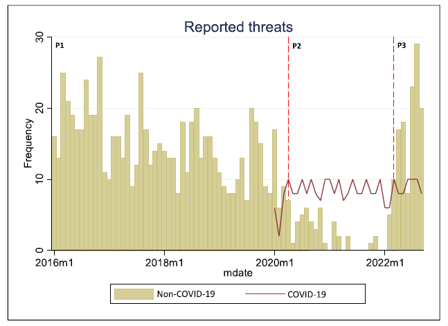 When analysing all reports on threats, there was a significant increase from period 1 to period 3 average monthly reports (14.98 vs. 26.13, p < 0.001). All non-COVID disease groups had a large significant reduction in period 2 in comparison to period 1.