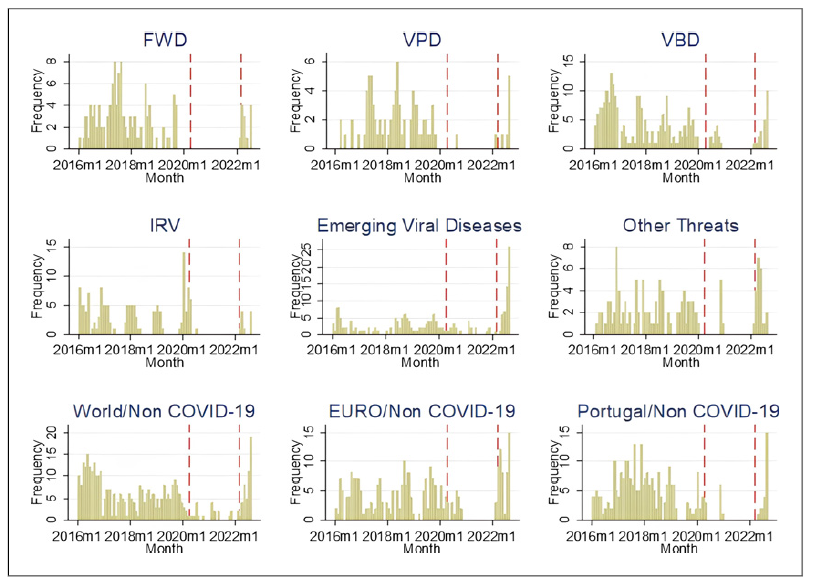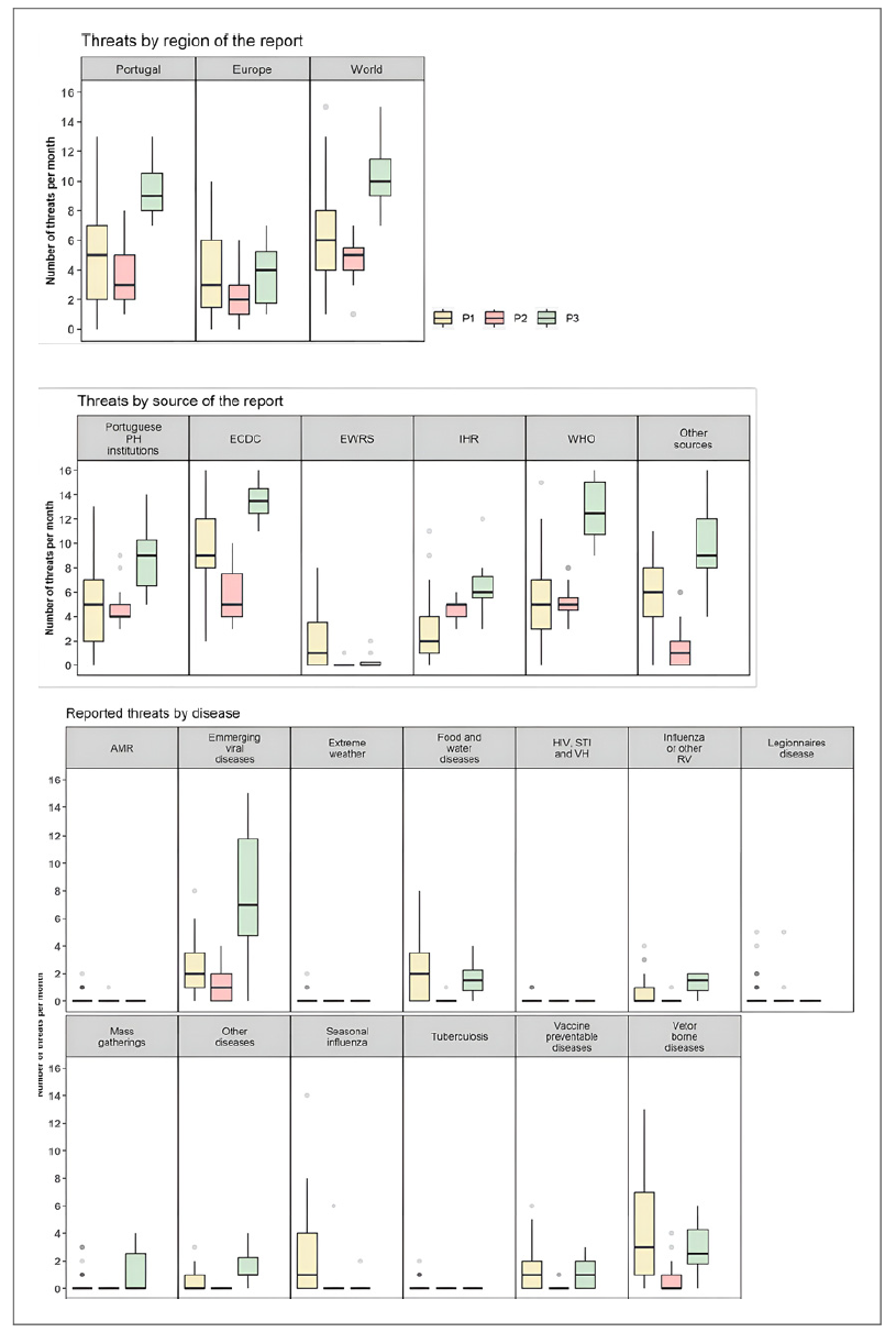 We described all reported threats (both new threats and updates on previously reported threats) from January 1, 2016, to September 30, 2022, by disease groups, geographical focus, and main information sources used for the event communication. Disease groups were categorized as vaccine-preventable diseases, vector-borne diseases, emerging viral diseases (not primarily transmitted by vectors), food and water borne diseases, and influenza and other respiratory virus (IRV), tuberculosis, legionnaires disease (LD), antimicrobial resistance (AMR), and “Others,” including non-infectious threats to health and mass gatherings. The geographical focus of the reports on threats was categorized as Portugal, EURO (EEA countries and Switzerland), and the world (other locations). Threats happening in different regions of the world simultaneously may include separate reports on the threat in Portugal and others on the disease in Europe or the world. Information source was categorized as WHO, ECDC, Portuguese Public Health (including DGS Directorate-General of Health; INSA National Reference Laboratory; Local and Regional Health Authorities/Public Health Units and Departments; Directorate-General of Food and Veterinary), and others. We defined 3 periods for analysis based on the pandemic situation: period 1 - before COVID-19 (January 1, 2016-March 31, 2020); period 2 - during COVID-19 restrictions (April 1, 2020-February 28, 2022); and period 3 - post-acute COVID-19 period (March 1, 2022-September 30, 2022). In Portugal, the initial state of emergency for COVID-19 was declared on March 23. Later it was de-escalated to a state of calamity, and, on February 17, 2022, the state of calamity was deescalated to a state of alert (the minimum severity legal framework state level) and almost all restrictions and recommendations were lifted. We described the monthly average number of reported threats by period for different categories of disease groups, sources, and geographical focuses.