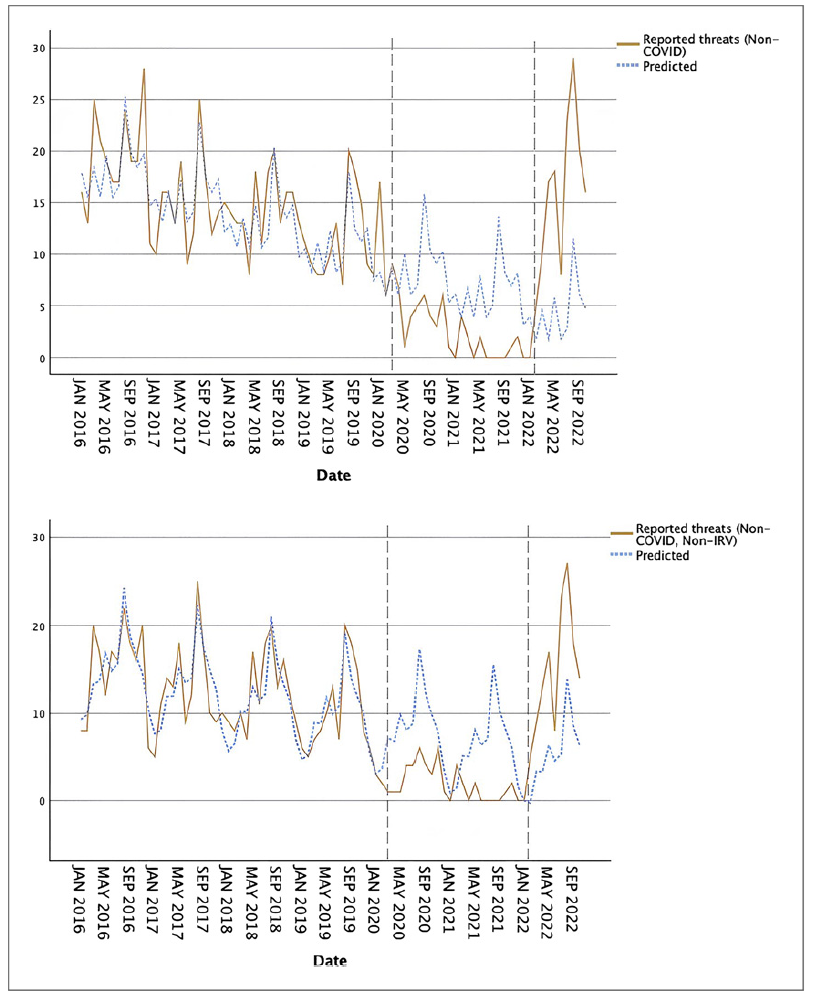Considering observed and expected non-COVID and non-IRV threats, from April 2020 to January 2022, there were 118 fewer threats than the 159 forecasted (−74%) in period 2. In period 3 from February 2022 to October 2022, there were 83 more threat reports than expected (+162%). The forecast used a Winter’s Additive model (alpha-0.056; gamma-5.6E−6; delta 0.001) adjusted until March 31 for the number of threats reported, stationary R2 = 0.82, test parameters of the model p < 0.05, adjustment quality Ljung Box p = 0.44, ACF and PACF not significant (Table 3).